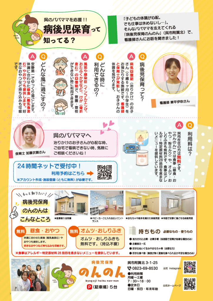 今回の2026年くれえばんマム3月号では、病後児保育施設『のんのん』さんを紹介しています。