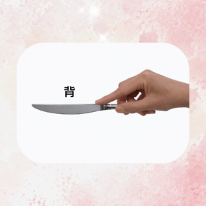ナイフは、持ち手の付け根あたりを親指と中指で軽く固定し、手で包むように持ちます。そして、人差し指を背に添えます。