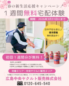 広島中央ヤクルト販売株式会社では、初回1週間分無料で「宅配体験」できる『新生活応援キャンペーン!!』を2026年3月31日㈫まで実施中ですよ!