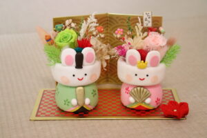コロンと可愛いサイズのうさぎのポット(お代理様とお雛様 2つ)に、樹脂粘土で作る縁起の良いフラワーピックと、淡い色のプリザーブドフラワーをアレンジします。