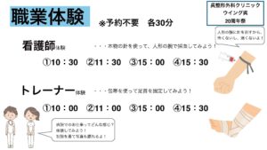 制服を着て写真を撮ったり、本物の針を使って人形で採血体験や包帯を使って足首の固定を体験できますよ✨
