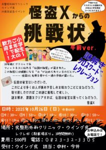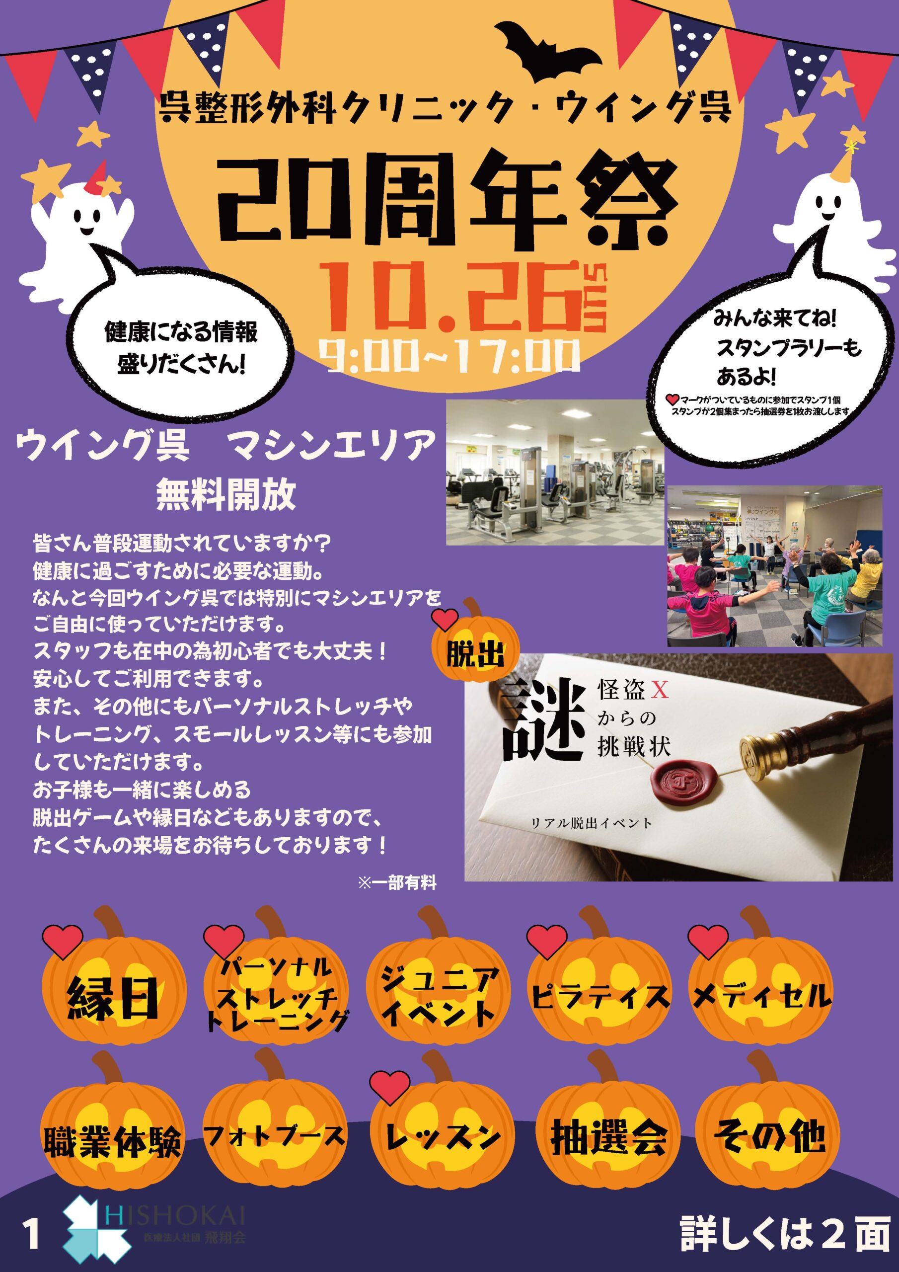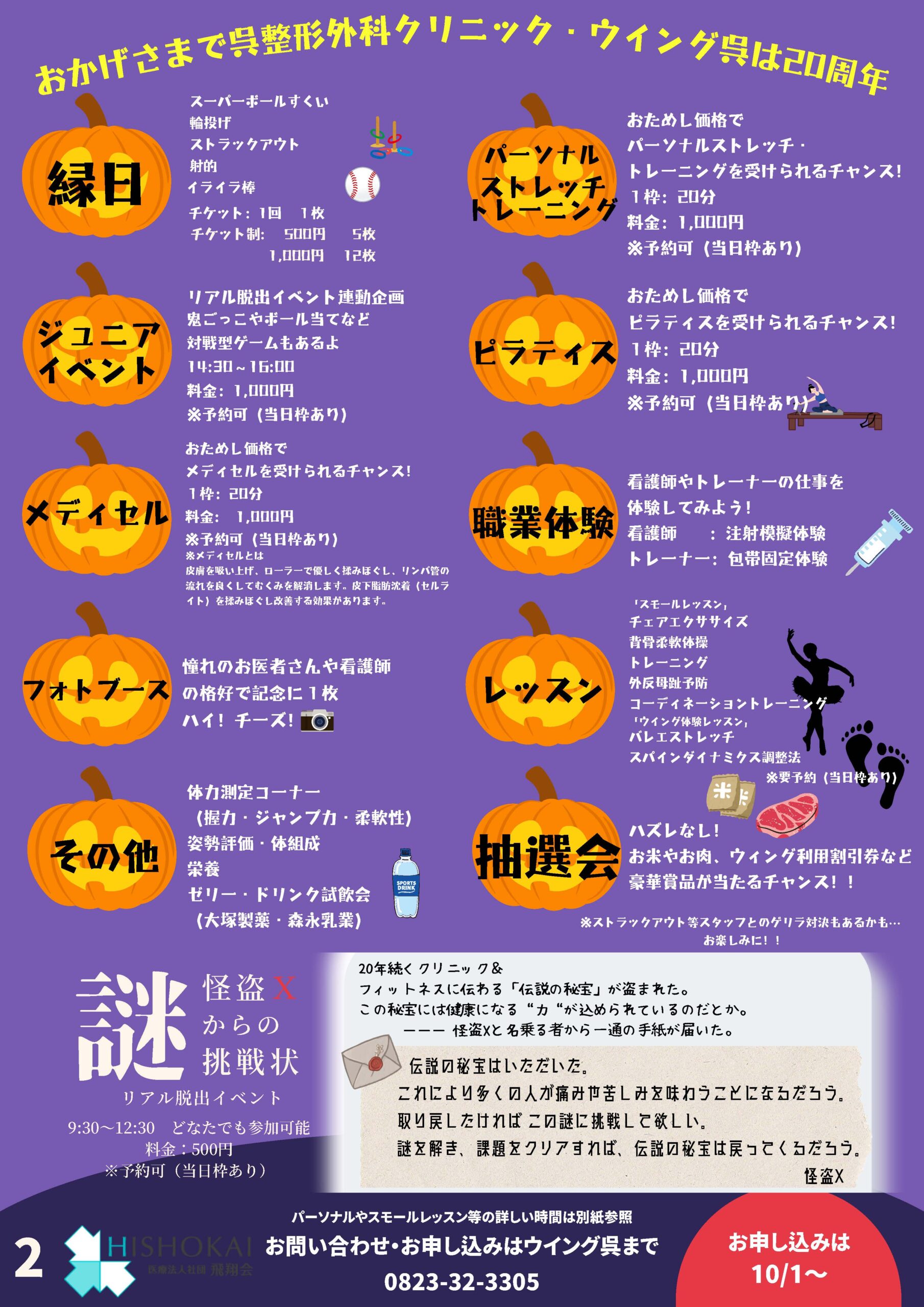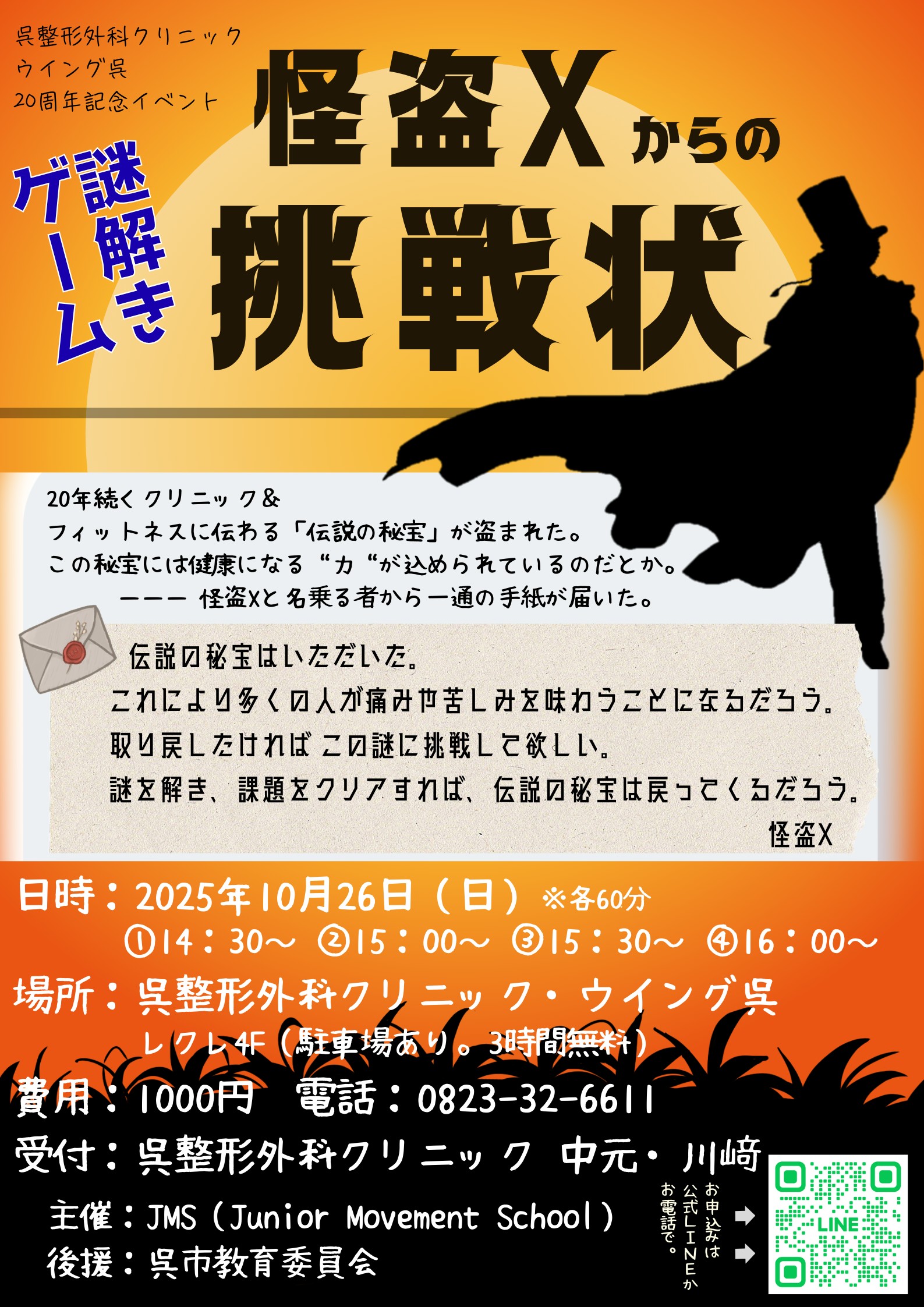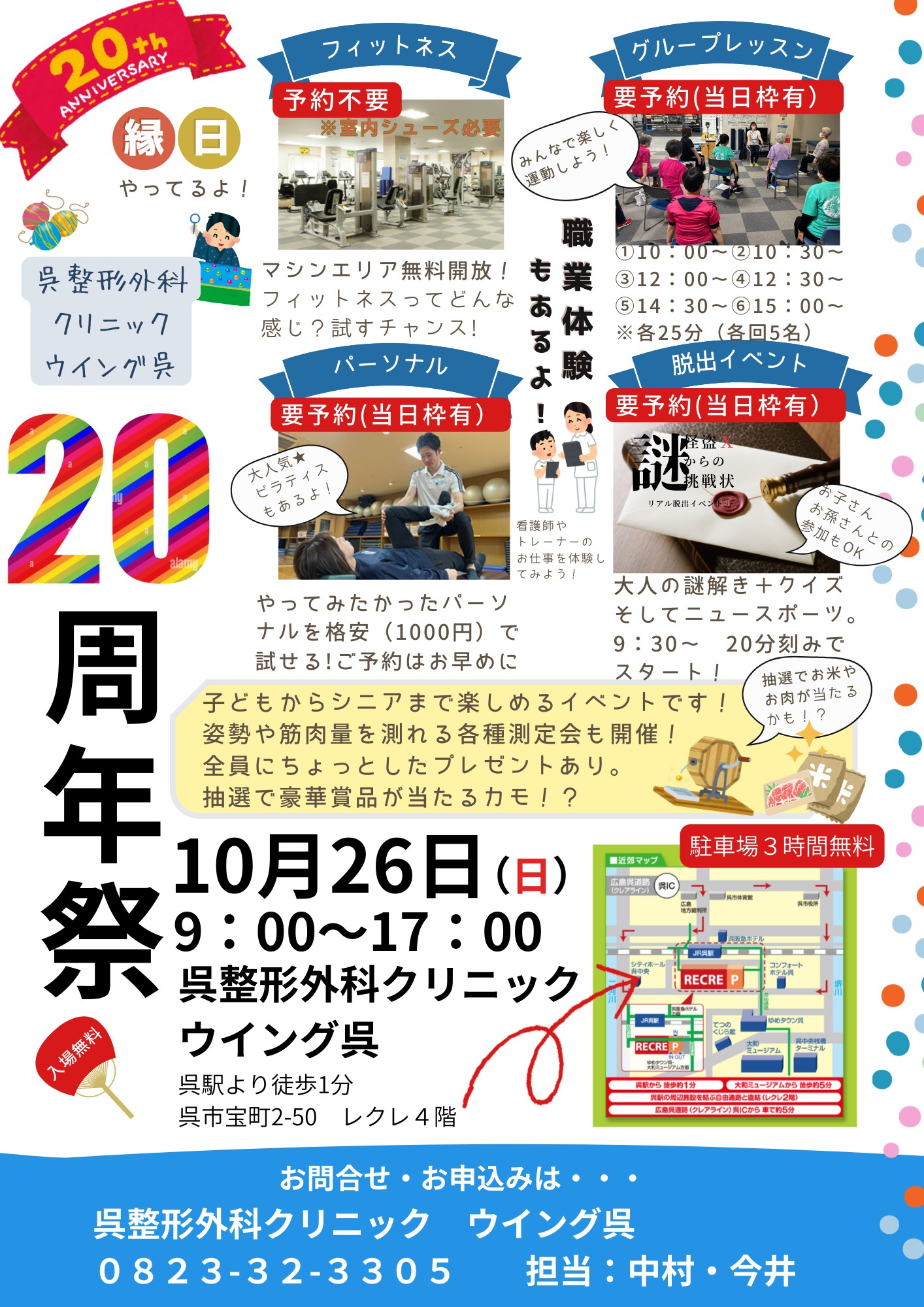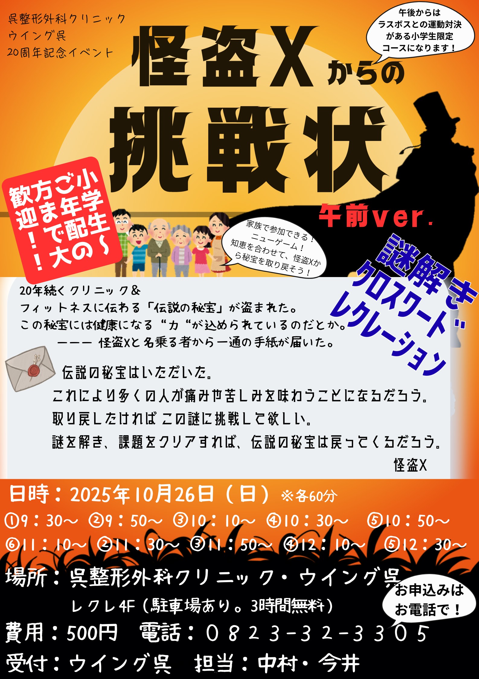 \怪盗Xの挑戦状や縁日など3世代で楽しめる1日に/ 20周年祭 が開催されます! 、   (画像をクリックすると大きくみれます) 、 呉整形外科クリニック・ウイング呉で20周祭がありますよ♪ 、 縁日(チケット制)や、職場体験のほか、体力測定コーナーなど3世代で楽しめるブースが盛り沢山です! 、 ウイング呉のマシンエリアの無料解放など、みどころ満載の20周年祭に行ってみませんか!? 、  怪盗Xからの挑戦状 【予約制】  、 怪盗Xに盗まれた20年続くクリニック&フィットネスに伝わる「伝説の秘宝」を見つけ出す謎解き企画がありますよ♪ 、 謎解きや運動エリアなどステージをクリアすることで伝説の秘宝を取り戻しましょう✨ 、    (画像をクリックするとこちらの詳細が確認できます) 、 3世代対象でお子さん〜年配の方まで楽しめる【午前の部(参加費:500円)】と より体を使ったステージが多い小学生向けの【午後の部(参加費:1,000円)】があります! 、 それぞれ各60分で時間枠があります。 事前申込はお電話(TEL:0823-32-3305)またはLINEより受付中ですよ〜♪ 、 、 枠に空きがあれば当日参加もできます🙆‍♀️ 、  職場体験【予約不要・参加無料】  l (画像をクリックするとこちらの詳細が確認できます) 、 病院のお仕事ってどんなことをするの?を体験できます♪ 、 制服を着て写真を撮ったり、本物の針を使って人形で採血体験や包帯を使って足首の固定を体験できますよ✨ 、  その他体験ブースも充実  。 (画像をクリックするとこちらの詳細が確認できます) 。 病院&フィットネスのイベントならでは!いろんな身体を使った体験ができますよ♪ 、 予約不要で利用できるフィットネスや格安で試せるパーソナル、姿勢や筋力量を測れる各種測定会など盛り沢山✨ 、 参加者全員にプレゼントや豪華景品が当たる!?抽選会など子どもから大人まで楽しめるイベントなので、 ご家族揃って遊びに行ってみてくださいね〜♪ 、 、 、 【日時】10月26日(日)9:00~17:00 ※ブースにより、時間枠があるものや参加料があります。詳しくはチラシをご確認ください。 【場所】呉整形外科クリニック・ウイング呉 呉市宝町2-50 レクレ4F (Googlemapへ) 【お問い合わせ】 呉整形外科クリニック・ウイング呉(担当:中元・川﨑) TEL:0823-32-3305