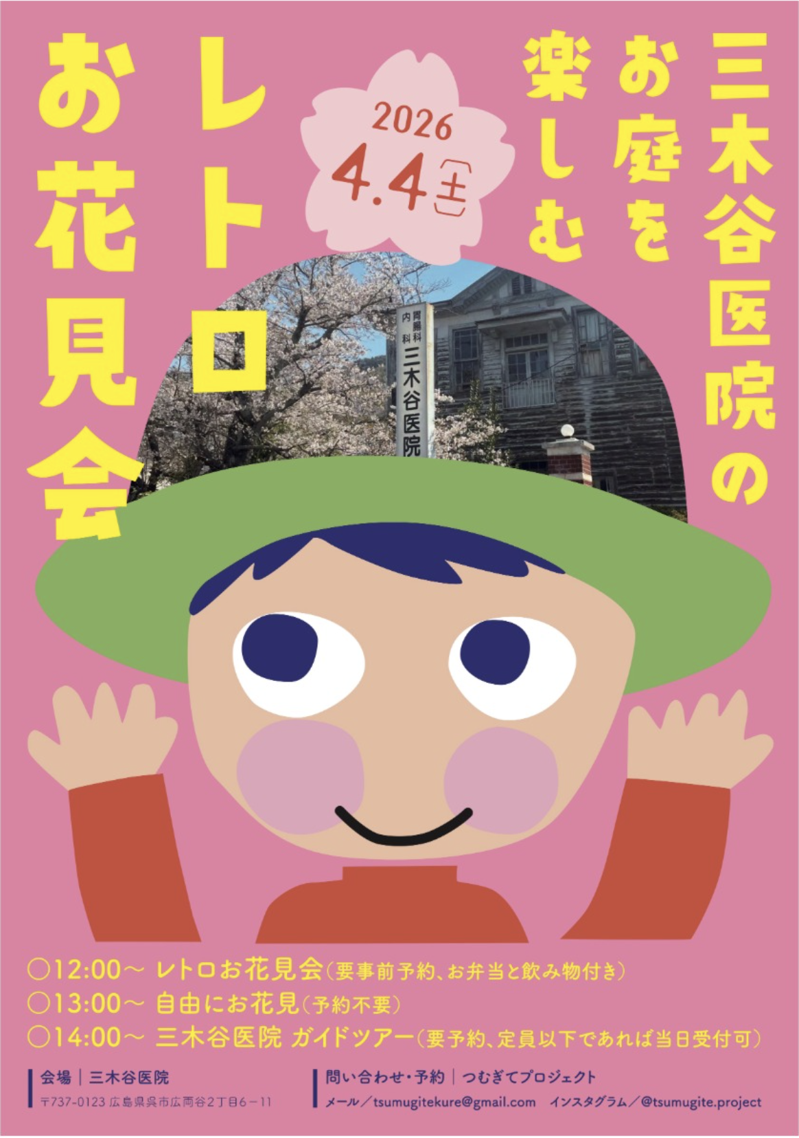 \大正ロマン感じる空間で春を楽しむ/ 三木谷医院のお庭を楽しむ レトロお花見会が開催されます! 、   (画像をクリックすると大きく見られます) 、 大正時代に建てられた趣ある木造建築の医院で、レトロな雰囲気を楽しめるお花見会が開催されますよ。 、 歴史ある建物とお庭は、当時の面影を色濃く残しており、どこか懐かしく特別な時間を味わえます。 、 春の花々に囲まれながら、ゆったりと過ごすひとときは、日常を忘れて心がほどける時間に。 、 写真撮影や散策を楽しみながら、レトロな空間でのお花見をぜひ体験してみませんか。 、  プラン①|手ぶらで楽しむお花見会(要予約)  ※こちらのプランは雨予報のため中止となりました。最新情報は@tsumugite.project にてご確認ください。 、 お花見弁当と飲み物をご用意した、手ぶらで楽しめるお花見会です。 音戸の舟唄保存会による舟唄披露とともに、春のひとときをお楽しみください。 入場時間|12:00〜13:00 参加費|3,000円/人 定員|20名 ※飲食の持ち込みも可 【要予約】メールまたはDMにて ,  プラン②|自由にお花見会(予約不要)  散策するだけでも、レジャーシートを広げてお弁当を食べても。 桜の中で、思い思いの時間をお過ごしください。 入場時間|13:00〜15:30(滞在は16:00まで可) 入場料|500円/人 ・お庭で飲食可/建物内見学可(公開区域のみ) ・火気厳禁 ・飲食物・シート等は各自ご持参ください ・ゴミは各自お持ち帰りください ,  イベント  ⚫︎三木谷医院 ガイドツアー(要予約) 14:00〜(約30分)/500円(別途入場料) 定員30名 ガイド|荒平悠さん 【要予約】メールまたはDMにて mail:tsumugitekure@gmail.com Instagram:@tsumugite.project お名前/予約内容/人数/メールアドレスなどのご連絡先 をお知らせください 、 ⚫︎銀木犀のアロマオイル体験 スペシャルゲスト|北谷龍樹さん(@ryujukitatani) 参加費|500円(申込不要) 昨年11月に咲いた三木谷医院の庭の銀木犀の花をつむぎてプロジェクトのメンバーが採取し、 北谷龍樹さんの技術により香り高いアロマオイルが抽出されました。 今回は、紅茶やレモネードと一緒に楽しめます。 、 ⚫︎レトロ食器ミニ市 13:00〜売り切れ次第終了 三木谷医院の食器棚に残されていた、レトロな食器の販売があります。 思いがけない出会いが楽しめます。 、 ※雨天時は外でのお花見以外は調整し開催予定。詳細はつむぎてプロジェクトInstagram:@tsumugite.project で最新情報をご確認ください。   、 【詳細情報】日時:2026年4月4日(土)    13:00〜15:30(滞在は16:00まで可)場所:三木谷医院 (広島県呉市広両谷2丁目6-11)お問い合わせ:Instagram:@tsumugite.project