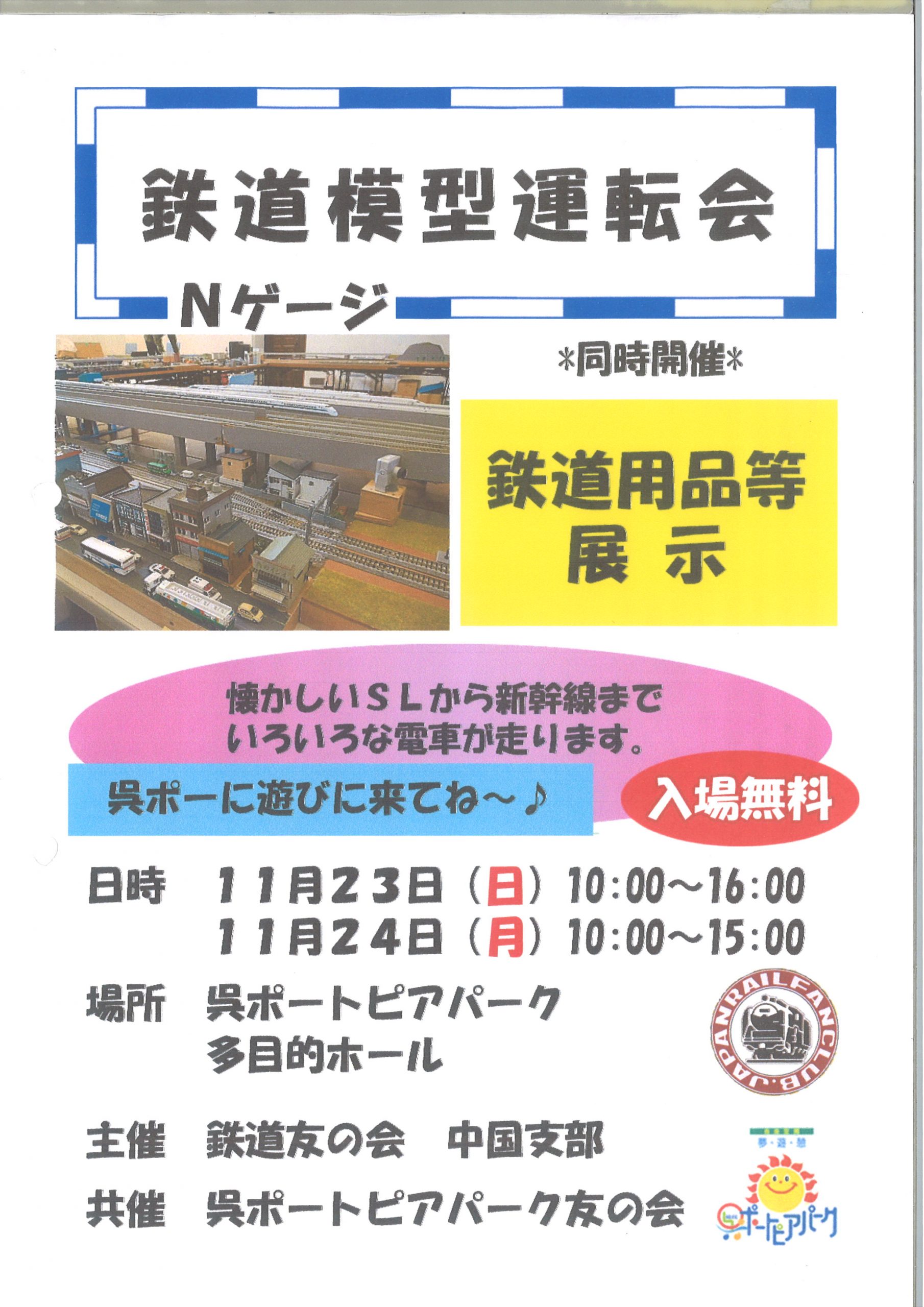 呉ポートピアパークにて鉄道模型運転会が開催されますよ!