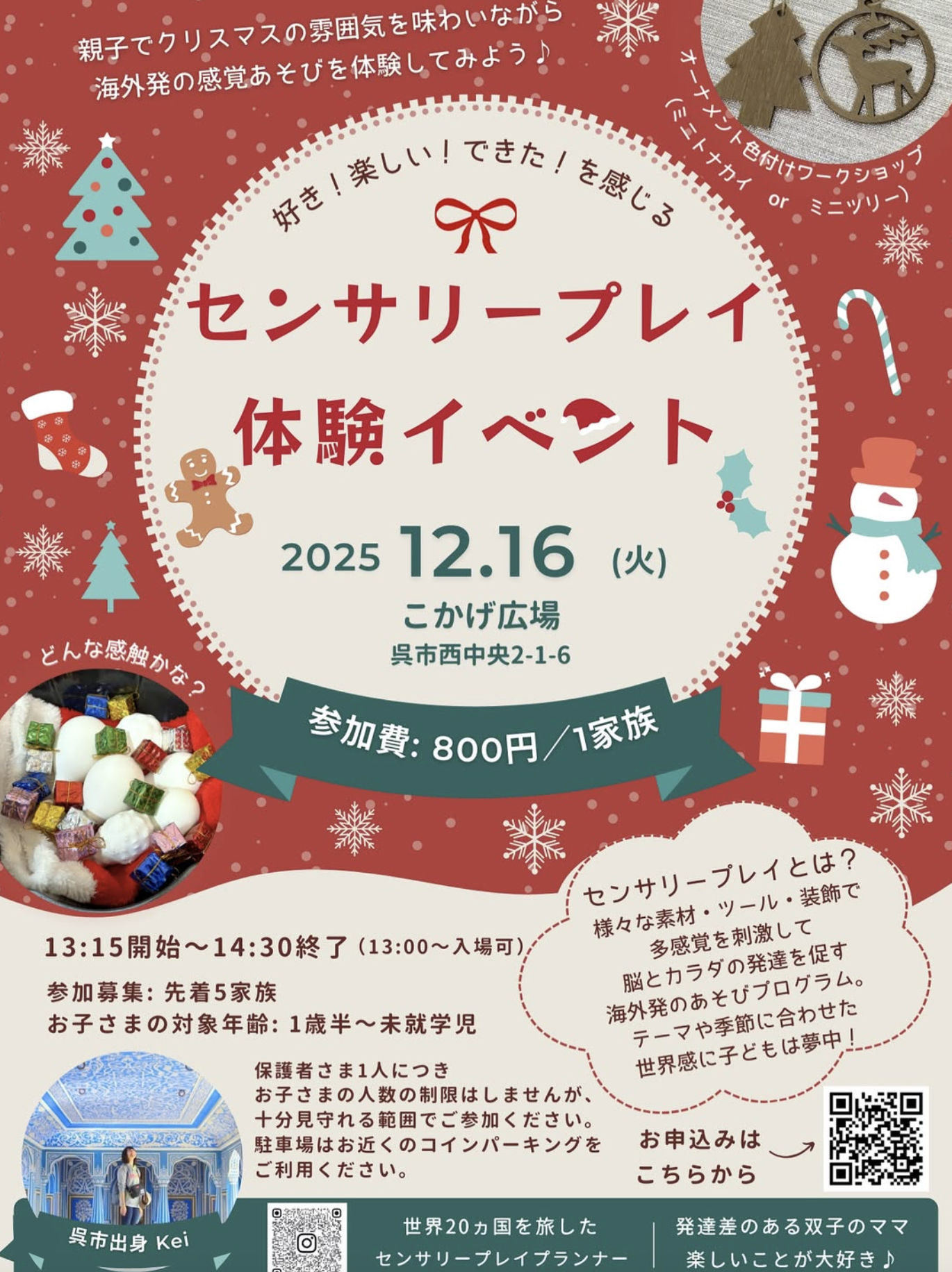 | 4月20日(日)〜 インラインスケート教室 in呉ポートピアパーク 10:00 AM 4月20日(日)〜 インラインスケート教室 in呉ポートピアパーク @ 呉ポートピアパーク 12月 14 @ 10:00 AM – 12:00 PM ![]() \アウトドアスクール/ インラインスケート教室が開催されます! 、 (画像をクリックすると大きくみれます) 、 呉ポートピアパークにて インラインスケート教室が開催されます! 、 インストラクターの方に自分のレベルに合った指導をしていただきます! 、 初めての方も、経験者の方もぜひ参加してみませんか♡ 、 ●日程 4月20日(日)・5月11日(日)・6月15日(日)・9月21日(日)・ 10月19日(日)・11月16日(日)・12月14日(日)・2026年3月15日(日) ※ 9月21日(日)まで申し込み受付中 、 ●持ち物 インラインスケート靴・プロテクター・ヘルメット 手袋(冬季の防寒用)、長めの靴下 スケート靴貸し出しあり(400円)※要事前申し込み。サイズ・数に限りがあります。 、 、 【日時】4月20日(日)・5月11日(日)・6月15日(日)・9月21日(日)・ 10月19日(日)・11月16日(日)・12月14日(日)・2026年3月15日(日) ※ 9月21日(日)まで申し込み受付中 10:00~12:00 ※小雨決行 【場所】呉ポートピアパーク 呉市天応大浜3-2-3 (Googlemapへ) 【参加費】700円(当日・現金のみ) スケート靴貸し出しあり(400円) ※要事前申し込み。 ※サイズ・数に限りがあります。 【定員】30名 【対象】5歳以上 【お申し込み】お申し込みフォーム 【お問い合わせ】 呉ポートピアパーク HP @kureportopiapark ☎︎0823-38-0560 | 12月16日(火)センサリープレイ体験イベント 1:15 PM 12月16日(火)センサリープレイ体験イベント @ こかげ広場 12月 16 @ 1:15 PM – 2:30 PM ![]() \好き!楽しい!できた!を感じる/ センサリープレイ体験イベントが開催されます! 、 (画像をクリックすると大きくみれます) 、 こかげ広場にてセンサリープレイ体験イベントが開催されますよ! 、 ⚫︎センサリープレイって? センサリープレイは、様々な素材・ツール・装飾で多感覚を刺激して脳とカラダの発達を促す海外発のあそびプログラムです。 テーマや季節に合わせた世界感に子どもは夢中になります♪ 、 センサリープレイの体験とオーナメントに色付けをするワークショップもあります! 、 親子でクリスマス気分を楽しみながら、好き!楽しい!を存分に感じられる感覚遊びを体験してみませんか♡ 、 、 【日時】12月16日(火) 13:15開始〜14:30終了(13:00〜入場可) 【場所】KOKAGEBUILDING1階 こかげ広場 呉市西中央二丁目1番6号 (Googlemapへ) ※駐車場はありません。近隣の有料駐車場をご利用ください。 【料金】800円 【定員】先着5家族 ※満席により受付終了:今後のイベントはInstagramをチェック 【対象】1歳半〜未就学児 【お申し込み】お申し込みフォームはコチラ 【お問い合わせ】 @sensory_play_planer_kei | 12月20日(土)呉ナザレン教会 こどもクリスマス会 1:30 PM 12月20日(土)呉ナザレン教会 こどもクリスマス会 @ 呉ナザレン教会 12月 20 @ 1:30 PM – 2:30 PM ![]() \大人も子どももみんなでクリスマスを楽しもう/ 呉ナザレン教会 こどもクリスマス会 が開催されます♪ 、 、 ステンドグラスのある教会でクリスマスを過ごしてみませんか? 、 クリスマスのお話や歌、ゲームなどをみんなで楽しみますよ! 、 お菓子のプレゼントもあるそうなので、大人も子どももみんなで過ごしませんか? 、 、 【日時】12月20日(土) 13:30〜14:30 【場所】 呉ナザレン教会 呉市中央2-4-14(Googlemapへ) 【料金】無料 【お問い合わせ】 呉ナザレン教会 ☎︎0823-21-8747 呉ナザレン教会Instagram 呉ナザレン教会HP | ||||
