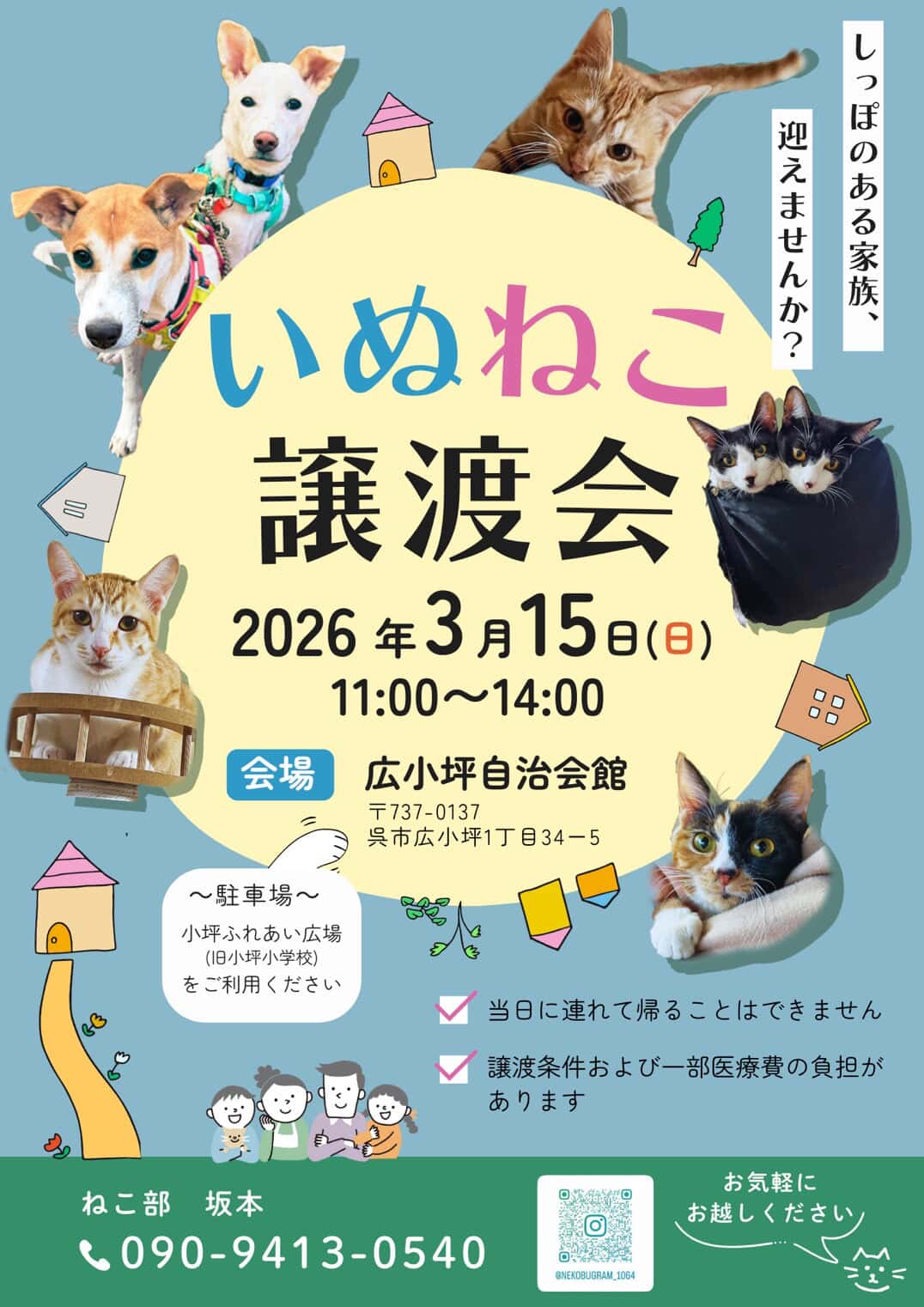 呉市広小坪自治会館にていぬねこ譲渡会が開催されます!