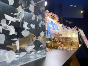 水槽の中には、満開の桜やお酒、そして舞い散る桜吹雪をイメージした華やかな演出が施されています。