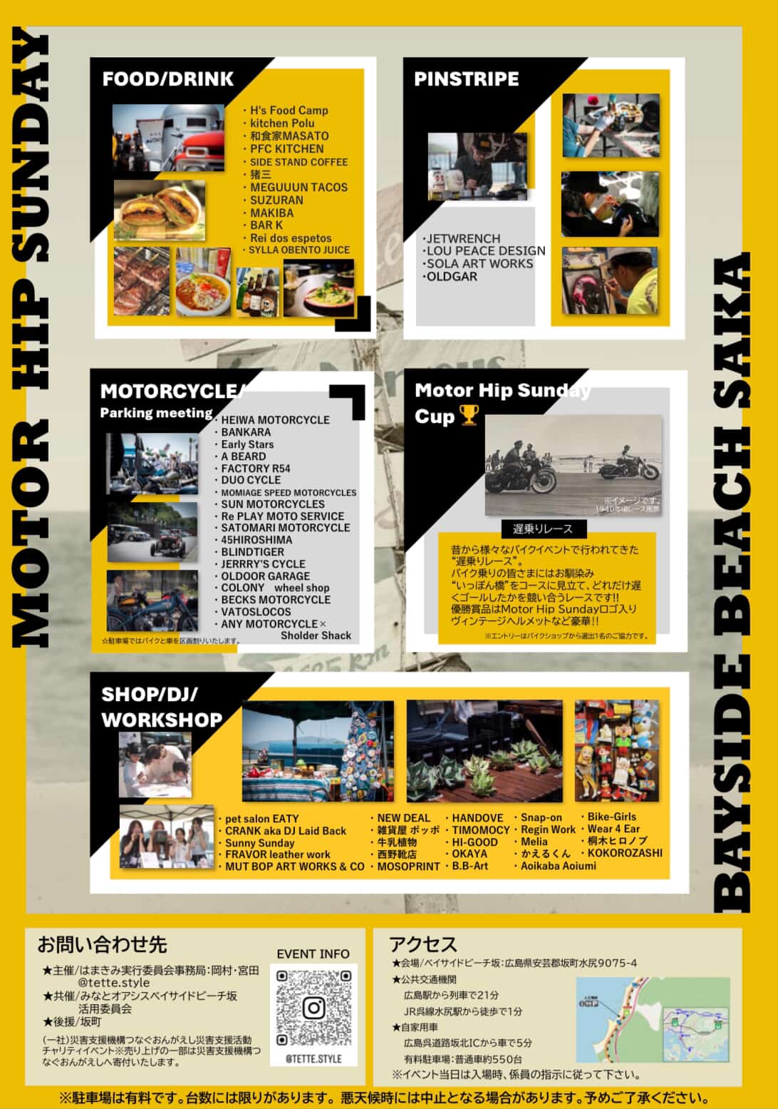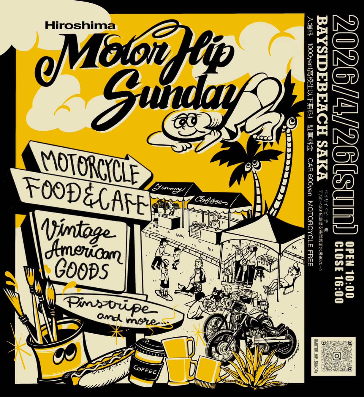 圧巻のバイク展示やビンテージ雑貨が勢揃い! ベイサイドビーチ坂で「Motor Hip Sunday」が開催されます! 、   (画像をクリックすると大きく見られます) 、 昨年に引き続き、今年もバイクカルチャーイベント「Motor Hip Sunday」が、ベイサイドビーチ坂で開催されますよ🚗 、 広島を代表するバイクショップ18店舗による車両展示は圧巻です! 。 さらに、アメリカンビンテージ雑貨や古着、一点物の海外買い付けアイテムなど、眺めているだけでワクワクするショップがずらりと並びます。 、 お子さまには、昔懐かしい「縁日」やワークショップもおすすめ✨ 、 大人向けには、淹れたてのスペシャリティコーヒーや、ビーチで食べたい絶品フードも充実しています☕️ 、 今回は新企画として、どれだけ“ゆっくり”ゴールできるかを競うユニークな「バイク遅乗りレース」も開催!🏍️ 、 優勝賞品はヴィンテージヘルメットなど豪華な内容だそうですよ。 、 海を眺めながら、家族みんなでアメリカンな雰囲気を楽しみつくす一日にしませんか? 、 、 【詳細情報】 【日時】 2026年4月26日(日)      10:00〜16:00      ※悪天候時には中止となる場合があります。 【会場】 ベイサイドビーチ坂      (広島県安芸郡坂町水尻9075-4) 【入場料】 1,000円(高校生以下無料) 【アクセス】 ⚫︎JR:呉線「水尻駅」から徒歩約1分 ⚫︎車:広島呉道路「坂北IC」から約5分 ※駐車場は有料(普通車約550台)です。台数に限りがあるためご注意ください。 【主催】 はまきみ実行委員会事務局 【公式情報】 Instagram @tette.style  @motor_hip_sunday