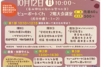 10月12日(日)いがもちサミット in くれ 10:00 AM 10月12日(日)いがもちサミット in くれ @ ビューポートくれ 2階大会議室 10月 12 @ 10:00 AM – 2:30 PM ![]() \呉のほかにもいがもちがあるの知っとった!?/ いがもちサミットinくれ が開催されます! 、 (画像をクリックすると大きく見られます) 、 呉のお祭りといえば、やぶといがもち。いがもちといえばお祭り✨ 、 亀山神社の秋の大祭の日に、「学ぶ!・食べる!・遊ぶ!」呉で初のいがもちイベントが開催されますよ♪ 、 広島いがもち研究会は、いがもち愛にあふれ、いがもちの魅力を広めていきたい栄養教諭のグループです。 、 呉市民がこよなく愛するいがもちは広島県の中でも呉市にのみに伝わるナゾ多き存在。 、 しかも、呉以外にも全国にいがもちは存在しているそう!!! 、 そこで、全国のいがもち・いがまんじゅうを持ち寄り、食べ比べ、いがもちや和菓子の魅力や歴史、食文化について語り合おうと、サミットが初開催されることになりました! 、 こちらはどなたでも参加OK! 定員までまだ若干の余裕がありますので、興味のある方は参加してみては!? 最終締切り(弁当申込なし)は前日まで受付中ですよ! 、 申込はこちらのの申込フォームから♪ 、 いがもち愛をぶつけてみませんか? 、 〜開催スケジュール〜 【開会】10:00〜 【第1部】講和 10:10〜12:15 ●講話①「日本の和菓子の歴史といがもちのミステリー」 ●講話②「学校給食と食文化」 ●講話③「学校教育における食文化の継承」(オンラインによる) 、 <昼食・休憩> 12:15~13:00 ・呉市内の小学生による呉の秋祭りに関する発表(動画) ・広島県の食文化や学校給食についての紹介(スライドショー) 、 【第2部】交流タイム 13:00〜14:30 ●全国いがもち自慢 ●我が町の和菓子自慢 ※持ち寄ったいがもちを食べ比べます。 、 【閉会】14:30 ※閉会後は呉市内や亀山神社など自由に散策タイム♪ いがもち好き必見のイベントですよ♪秋祭りと合わせて楽しんでみては!? 、 、 、 、 【日時】10月12日(日) 第1部:10:00〜12:15 第2部:13:00〜14:30 第3部:14:30〜 【場所】ビューポートくれ 2階大会議室 呉市中通1-1-2(Googlemapへ) 【料金】500円 【定員】先着60名 【お申し込み】こちらの申込フォームから 【お問い合せ】広島いがもち研究会 LINEより 10月12日(日)・13日(祝)・19日(日) 木陰で紡ぐクールシェア恋ヶ浜 11:00 AM 10月12日(日)・13日(祝)・19日(日) 木陰で紡ぐクールシェア恋ヶ浜 @ 恋ヶ浜キャンプ場 10月 12 @ 11:00 AM ![]() \楽しく・美味しく・地球にもやさしく/ 木陰で紡ぐクールシェア in 恋ヶ浜 が開催されます! 、 (画像をクリックすると大きくみれます) 、 10月に入ってもまだまだ日中は暑い日もありますね。 、 恋ヶ浜の黒松林の木陰で、「そうめん流し」や「ハンモック体験」、SDGsについてゲームで楽しく学ぶ「ゴー・ゴールズ」体験がありますよ♪ 、 涼しい木陰で楽しみながら、地球環境について学べる機会となっていますので、ぜひお子さんと一緒に参加してみませんか? 。 家族・グループで美味しく、楽しく温暖化対策を紡いでいきましょう! 内容 ☆そうめん流し☆ 《開催時間》 ①11:00〜 ②11:30〜 ③12:00~ ④12:30~ 《定員》 各回20名 《参加費》 中学生以上:600円/名 3歳以上:300円/名 3歳未満は無料 、 ☆ハンモック体験・「ゴー・ゴールズ」体験☆ こちらは、そうめん流しに参加された親子が対象です。(参加費無料) 、 詳細・申込は申し込みフォームよりご確認ください!(締切:開催日の前日まで) 。 〜「クールシェア」という言葉を知っていますか?〜 家庭のエアコンを消して、図書館などの公共施設、公園などに出かけて涼しさを分かち合い電力使用量とCO2排出量を削減しよう。という温暖化対策の取り組みです。 こちらのイベントでは、恋ヶ浜の黒松林の木陰を涼しい場所(クールシェアスポット)として活用して、温暖化対策に取り組む実証事業となっています! 。 、 、 【日時】10月12日(日)・13日(祝)・19日(日) ①11:00〜 ②11:30〜 ③12:00~ ④12:30~ 【会場】恋ヶ浜キャンプ場 呉市蒲刈町大浦 (Googlemapへ) 【料金】中学生以上:600円/名 3歳以上:300円/名 3歳未満は無料 ※「ハンモック体験」・「ゴー・ゴールズ体験」は「そうめん流し」に参加した親子がご参加いただけます。 、 【お申し込み】申し込みフォームはコチラ ※ 申込締切は、開催日の前日までです。 【お問合せ】 Team JIN「仁」 平中 hiranaka0101@gmail.com わくわく工作サンデー! 11:00 AM わくわく工作サンデー! @ 呉市立美術館 10月 12 @ 11:00 AM – 4:00 PM ![]() \にちようびはびじゅつかんにいこう/ わくわく工作サンデー! が開催されます♪ 、 (画像をクリックすると大きくみれます) 、 9月6日(土)〜11月3日(月・祝)の期間に開催される特別展 『開館20周年記念 美術にであう5つのとびら』の関連イベントとして、 予約なし・時間内いつでも参加できるわくわく工作サンデー!が開催されますよ♪ 。 こどももおとなも参加できるので、にちようびはびじゅつかんに遊びに行ってみませんか? 、 9/7(日) 六角形ウォールデコ ダ