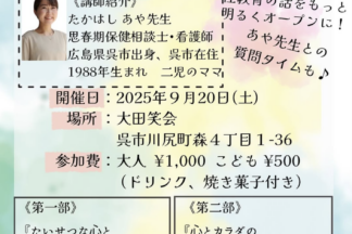 6/19(木)・9/30(火)・10/1(水) くれオンパク 体験プログラム提供者向け説明会・ワークショップ 9:00 AM 6/19(木)・9/30(火)・10/1(水) くれオンパク 体験プログラム提供者向け説明会・ワークショップ @ 6/19・9/30:ビューポートくれ2F / 9/29:呉市役所601会議室 10月 1 @ 9:00 AM ![]() 「ここだけ、あなたのためだけ」の体験をしよう! 呉市の新しい発見を楽しむ〝くれオンパク〟 体験プログラム提供者向け 説明会・ワークショップ が開催されます! 、 呉の隠れた魅力を再発見できるプログラムが多数用意された「くれオンパク」が今年も開催されますよ♪ 、 2025年9月20日(土)~3月2日(月)にかけて行われるくれオンパクは、地域の人々が提供する小規模の体験プログラムを一定期間にいくつも開催するイベントで、まちの資源を発掘し、まちに新たなチャレンジと、まちのファンをつくりだす呉市の事業です。 、 (画像をクリックするとくれオンパクHPへ遷移します。) 、 今年の開催に先立ち、体験プログラム提供者向けの説明会・ワークショップが3日間開催されますよ♪ 、 くれオンパクって何!?どんなことをしていたの!?と気になった方はこちらから開催中のプログラムをご覧いただけます。 くれオンパクHP:https://kureonpaku.com/ 、 自分に何ができるの?こんなことをしてみたいけど、どうかな?と思った方はまずは説明会に参加してみませんか!? 、 ワークショップで〝こんなことをしてみたい〟を深堀りし、形にするヒントや発信する際のヒントにもなりますよ♪ 、 〜説明会・ワークショップ 日程〜 ※いずれか1回のみの参加です。 、 ●6/19(木) ❶9:00~11:30❷13:00~15:30❸18:30~21:00 場所:ビューポートくれ2階 、 ●9/30(火) ❶13:30~16:00 ❷18:30~21:00 場所:ビューポートくれ2階 、 、 ●10/1(水) ❶ 9:00~11:30 場所:ビューポートくれ2階 、 〜このような方はぜひご参加ください♪〜 、 『得意なことを人に伝えたい』 ハンドメイドやスポーツなど、これまでイベントや教室を開催した経験のない方もで大丈夫!プログラムの組み立て方や費用についてもワークショップで知ることができますよ! 、 『事業を知ってもらいたい』 これまで実施してきた事業や企画をブラッシュアップして、もっと地域の人や観光客の方に知ってもらうためのコンテンツづくりをワークショップでしることができます。 、 参加申し込みフォームはこちら くれオンパクHP:https://kureonpaku.com/ くれオンパクInstagram:@kureonpaku 、 9月30日(火)〜10月4日(土)家庭教育相談 【要予約】 10:00 AM 9月30日(火)〜10月4日(土)家庭教育相談 【要予約】 @ 呉市生涯学習センター(つばき会館)・呉市役所8階 10月 1 @ 10:00 AM – 5:00 PM ![]() \一人で悩んでいませんか?/ 家庭教育相談があります! 、 (画像をクリックすると大きくみれます) 、 9月30日(火)〜10月4日(土)の期間中、家庭教育相談が開催されます! 【要申込:9月15日(月・祝) 17時締切】 、 ・学校に行きたくないという子どもにどう声をかければいいの? ・子育てについて相談する人がいない・・・ 、 など、子どもの成長やしつけや家庭教育、子育てのお悩みを広く受け付けていますよ。 、 秘密厳守で悩みをサポートしてもらえますので、どこに相談したら良いのかわからないと悩んでいる方、一度話をしてみませんか? 、 気になる方はお申し込みの上参加してみてくださいね。 、 、 【日時】9月30日(火)〜10月4日(土) 10:00〜17:00 【会場】 ●呉市生涯学習センター(つばき会館) 呉市中央6丁目2番9号 (Googlemapへ) ●呉市役所8階 呉市中央4丁目1番6号 (Googlemapへ) ※相談時の託児が可能です。 【お申し込み】 【要申込:9月15日(月・祝) 17時締切】 ☎︎0823-25-3461(文化振興課)または お申し込みフォームよりお申込みください。 後日,相談日と時間を御連絡します。 【お問合せ】 呉市文化スポーツ部 文化振興課 社会教育グループ ☎︎0823-25-3461 | 9月30日(火)〜10月4日(土)家庭教育相談 【要予約】 10:00 AM 9月30日(火)〜10月4日(土)家庭教育相談 【要予約】 @ 呉市生涯学習センター(つばき会館)・呉市役所8階 10月 2 @ 10:00 AM – 5:00 PM ![]() \一人で悩んでいませんか?/ 家庭教育相談があります! 、 (画像をクリックすると大きくみれます) 、 9月30日(火)〜10月4日(土)の期間中、家庭教育相談が開催されます! 【要申込:9月15日(月・祝) 17時締切】 、 ・学校に行きたくないという子どもにどう声をかければいいの? ・子育てについて相談する人がいない・・・ 、 など、子どもの成長やしつけや家庭教育、子育てのお悩みを広く受け付けていますよ。 、 秘密厳守で悩みをサポートしてもらえますので、どこに相談したら良いのかわからないと悩んでいる方、一度話をしてみませんか? 、 気になる方はお申し込みの上参加してみてくださいね。 、 、 【日時】9月30日(火)〜10月4日(土) 10:00〜17:00 【会場】 ●呉市生涯学習センター(つばき会館) 呉市中央6丁目2番9号 (Googlemapへ) ●呉市役所8階 呉市中央4丁目1番6号 (Googlemapへ) ※相談時の託児が可能です。 【お申し込み】 【要申込:9月15日(月・祝) 17時締切】 ☎︎0823-25-3461(文化振興