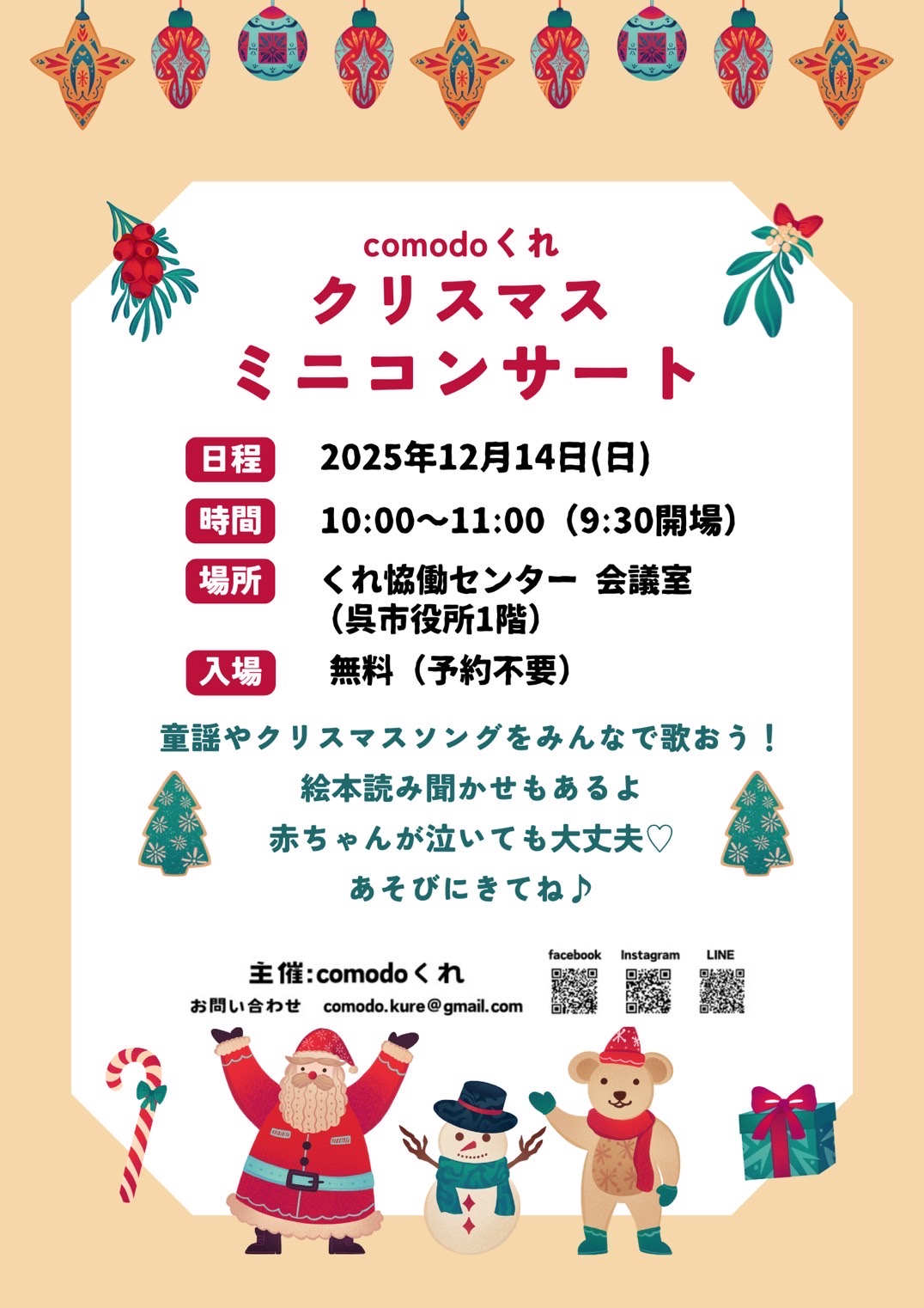 | 12月14日(日)クリスマス ミニコンサート 10:00 AM 12月14日(日)クリスマス ミニコンサート @ くれ恊働センター 会議室(呉市役所1階) 12月 14 @ 10:00 AM – 11:00 AM ![]() \みんなで歌ってクリスマスを楽しもう!/ クリスマス ミニコンサートが開催されます! 、 (画像をクリックすると大きくみれます) 、 呉市市民協働センターにてクリスマス ミニコンサートが開催されます! 、 童謡やクリスマスソングを歌って、クリスマスを楽しみませんか♡ 、 途中泣いても大丈夫なので、赤ちゃんの参加も大歓迎ですよ♪ 、 入場無料・予約不要なので、みんなでミニコンサートを楽しみましょう♡ 、 、 【日程】12月14日(火)10:00~11:00(開場9:30) 【場所】呉市市民協働センター 呉市中央4-1-6 呉市役所1階(Google mapへ) 【料金】無料(予約不要) 【お問い合わせ】 @comodo.kure comodo.kure@gmail.com 4月20日(日)〜 インラインスケート教室 in呉ポートピアパーク 10:00 AM 4月20日(日)〜 インラインスケート教室 in呉ポートピアパーク @ 呉ポートピアパーク 12月 14 @ 10:00 AM – 12:00 PM ![]() \アウトドアスクール/ インラインスケート教室が開催されます! 、 (画像をクリックすると大きくみれます) 、 呉ポートピアパークにて インラインスケート教室が開催されます! 、 インストラクターの方に自分のレベルに合った指導をしていただきます! 、 初めての方も、経験者の方もぜひ参加してみませんか♡ 、 ●日程 4月20日(日)・5月11日(日)・6月15日(日)・9月21日(日)・ 10月19日(日)・11月16日(日)・12月14日(日)・2026年3月15日(日) ※ 9月21日(日)まで申し込み受付中 、 ●持ち物 インラインスケート靴・プロテクター・ヘルメット 手袋(冬季の防寒用)、長めの靴下 スケート靴貸し出しあり(400円)※要事前申し込み。サイズ・数に限りがあります。 、 、 【日時】4月20日(日)・5月11日(日)・6月15日(日)・9月21日(日)・ 10月19日(日)・11月16日(日)・12月14日(日)・2026年3月15日(日) ※ 9月21日(日)まで申し込み受付中 10:00~12:00 ※小雨決行 【場所】呉ポートピアパーク 呉市天応大浜3-2-3 (Googlemapへ) 【参加費】700円(当日・現金のみ) スケート靴貸し出しあり(400円) ※要事前申し込み。 ※サイズ・数に限りがあります。 【定員】30名 【対象】5歳以上 【お申し込み】お申し込みフォーム 【お問い合わせ】 呉ポートピアパーク HP @kureportopiapark ☎︎0823-38-0560 | 12月16日(火)センサリープレイ体験イベント 1:15 PM 12月16日(火)センサリープレイ体験イベント @ こかげ広場 12月 16 @ 1:15 PM – 2:30 PM ![]() \好き!楽しい!できた!を感じる/ センサリープレイ体験イベントが開催されます! 、 (画像をクリックすると大きくみれます) 、 こかげ広場にてセンサリープレイ体験イベントが開催されますよ! 、 ⚫︎センサリープレイって? センサリープレイは、様々な素材・ツール・装飾で多感覚を刺激して脳とカラダの発達を促す海外発のあそびプログラムです。 テーマや季節に合わせた世界感に子どもは夢中になります♪ 、 センサリープレイの体験とオーナメントに色付けをするワークショップもあります! 、 親子でクリスマス気分を楽しみながら、好き!楽しい!を存分に感じられる感覚遊びを体験してみませんか♡ 、 、 【日時】12月16日(火) 13:15開始〜14:30終了(13:00〜入場可) 【場所】KOKAGEBUILDING1階 こかげ広場 呉市西中央二丁目1番6号 (Googlemapへ) ※駐車場はありません。近隣の有料駐車場をご利用ください。 【料金】800円 【定員】先着5家族 ※満席により受付終了:今後のイベントはInstagramをチェック 【対象】1歳半〜未就学児 【お申し込み】お申し込みフォームはコチラ 【お問い合わせ】 @sensory_play_planer_kei | 12月20日(土)呉ナザレン教会 こどもクリスマス会 1:30 PM 12月20日(土)呉ナザレン教会 こどもクリスマス会 @ 呉ナザレン教会 12月 20 @ 1:30 PM – 2:30 PM ![]() \大人も子どももみんなでクリスマスを楽しもう/ 呉ナザレン教会 こどもクリスマス会 が開催されます♪ 、 、 ステンドグラスのある教会でクリスマスを過ごしてみませんか? 、 クリスマスのお話や歌、ゲームなどをみんなで楽しみますよ! 、 お菓子のプレゼントもあるそうなので、大人も子どももみんなで過ごしませんか? 、 、 【日時】12月20日(土) 13:30〜14:30 【場所】 呉ナザレン教会 呉市中央2-4-14(Googlemapへ) 【料金】無料 【お問い合わせ】 呉ナザレン教会 ☎︎0823-21-8747 呉ナザレン教会Instagram 呉ナザレン教会HP | ||||